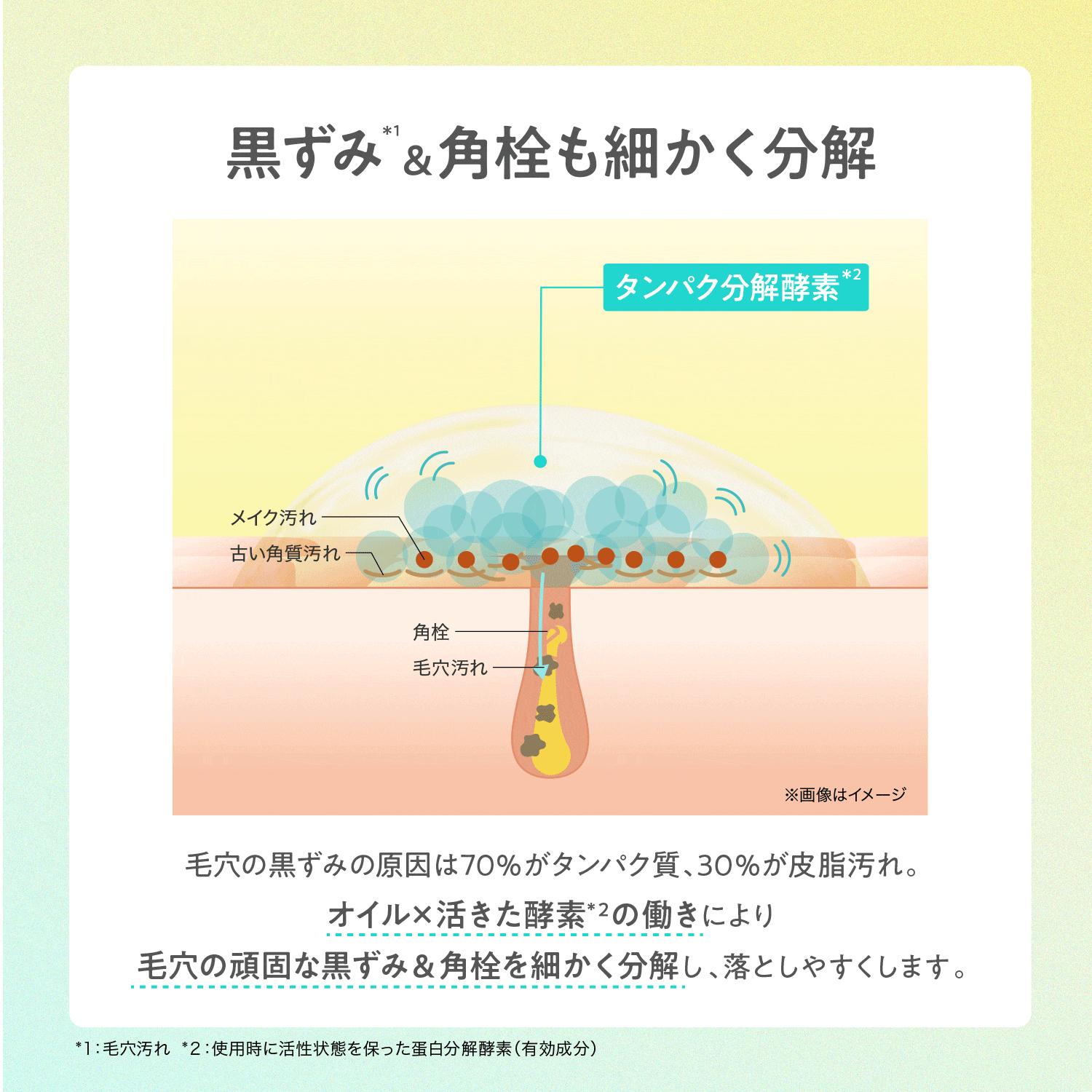 毛穴の黒ずみの原因は70%がタンパク質、30%が皮脂汚れ。オイル×活きた酵素で両方にアタックするから、相乗効果で毛穴スッキリ。