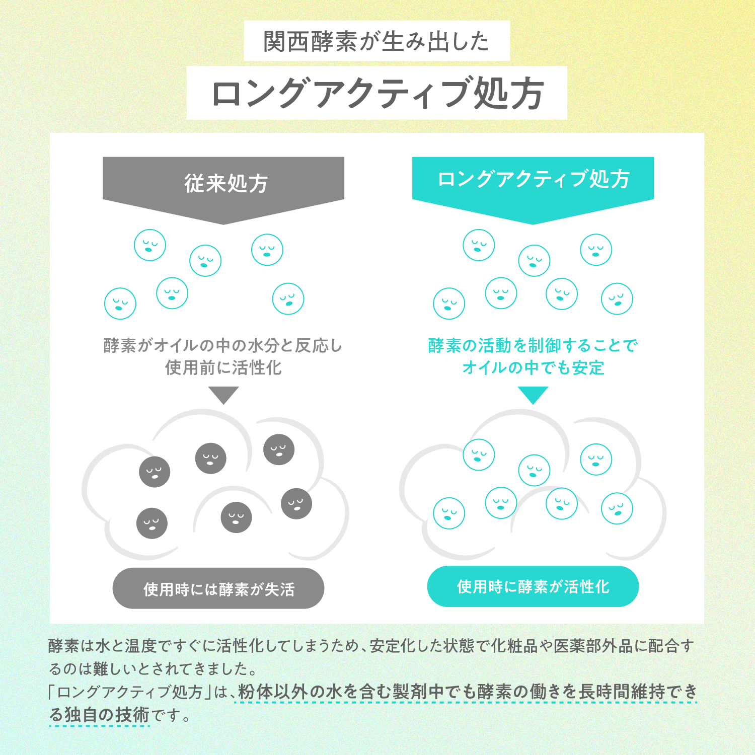 日本初:有効成分「蛋白分解酵素」を含む各種医薬部外品として/オイル:パルミチン酸エチルヘキシル、エチルヘキサン酸セチル、トリポリヒドロキシステアリン酸ジペンタエリスリチル(洗浄成分)/メラニンくすみ:メラニンを含む古い角質による/活きたままの酵素:使用時に活性状態を保った蛋白分解酵素(有効成分)/肌荒れ防止成分:グリチルレチン酸ステアリル(有効成分)